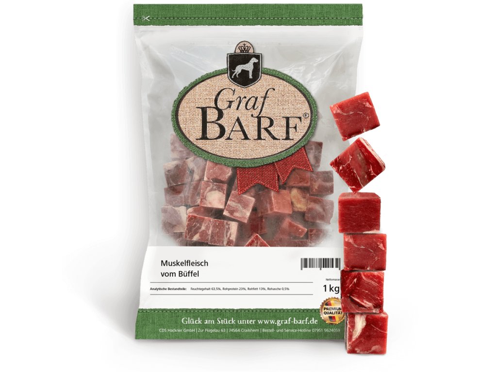 Buvolí svalové maso Graf Barf je vysoce kvalitní maso bohaté na bílkoviny. Obsahuje důležité živiny, jako jsou bílkoviny, minerály a vitamíny, a přispívá tak k vyvážené syrové stravě. Je nejen neuvěřitelně lahodné, ale také neuvěřitelně zdravé. Je ideální pro atletické čtyřnohé kamarády a je také vysoce stravitelné, takže je ideální pro citlivé chlupaté kamarády. Buvolí maso pochází z vodních buvolů, zmrazuje se ve velkých blocích a poté se nakrájí na kostky.