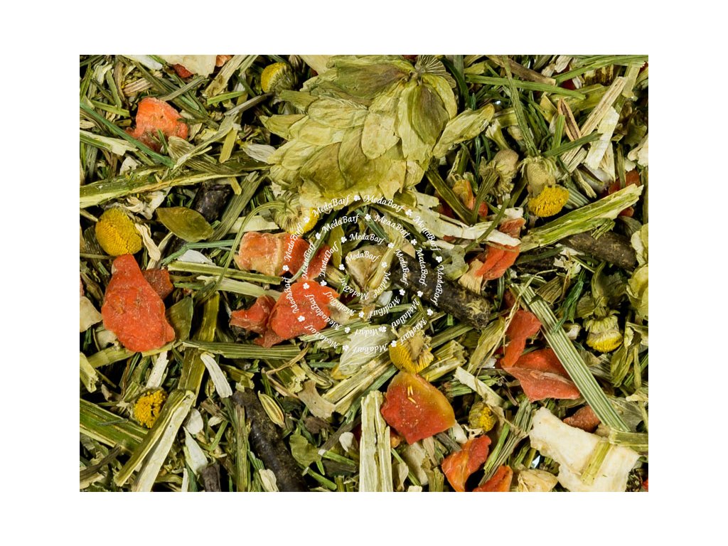 Optimální přírodní doplněk ke každodennímu krmení syrovým masem. Tato bylinková směs je navržena tak, aby podpořila trávení, detoxikaci a celkovou vitalitu psa. Fenykl a heřmánek působí zklidňujícím účinkem na zažívání, přeslička rolní prospívá srsti, drápům a pojivové tkáni díky obsahu kyseliny křemičité. Vojtěška dodává vápník, železo, zinek a další důležité vitamíny, zatímco pampeliška podporuje funkci jater, ledvin a močových cest.