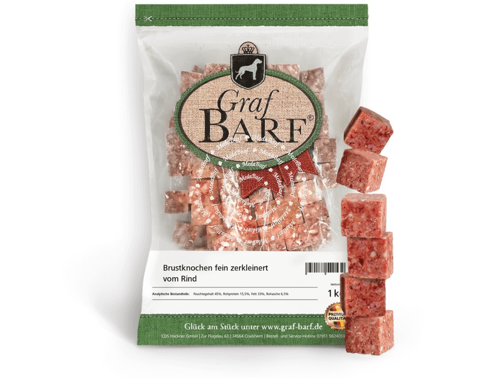 Tyto kostní kostky vyrobené z jemně mletých hovězích prsních kostí jsou vhodné zejména pro velmi malé psy, juniory a seniory, protože ti často obtížně snášejí tvrdou kost a snědí ji úplně. Naše kostní kostky jsou díky své jemně mleté struktuře snadno stravitelné a poskytují důležité živiny, jako je vápník a fosfor, pro zdravou strukturu kostí. Hovězí prsní kosti se jemně namelejí na velké bloky, zmrazí a poté nakrájejí na kostky.