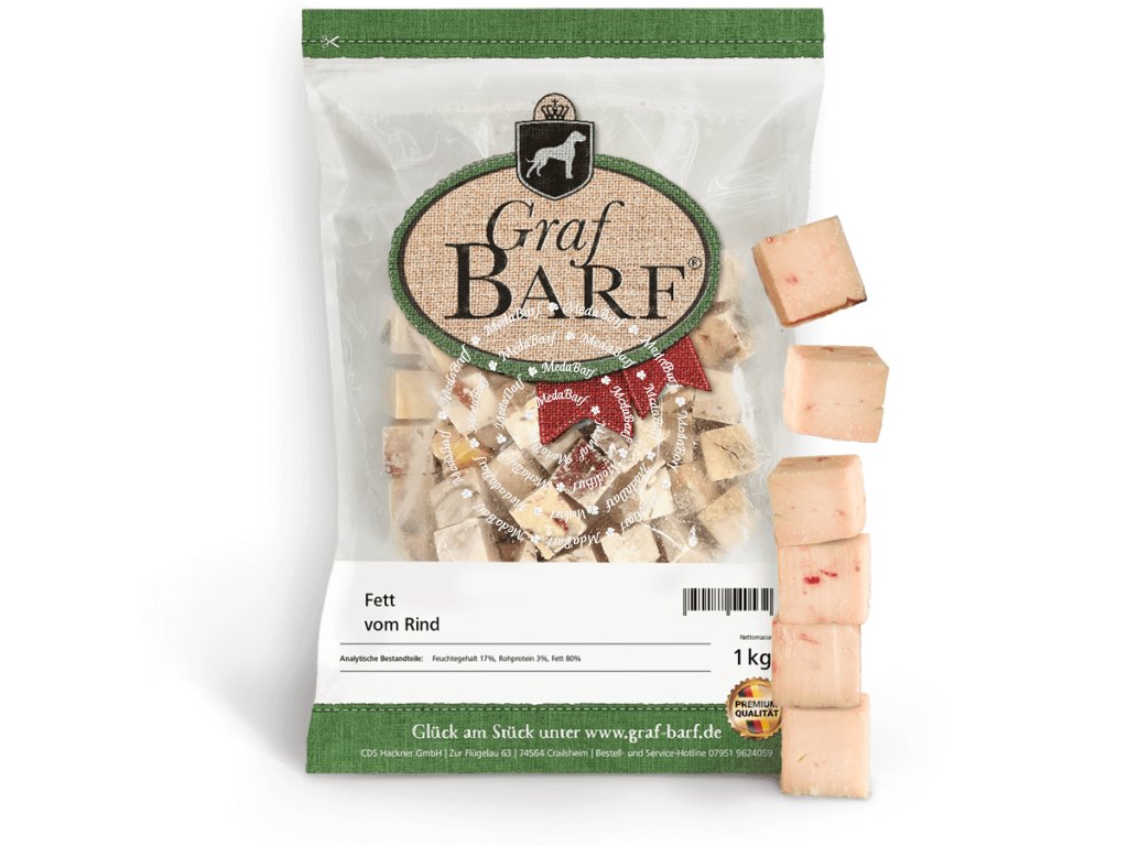 Hovězí tuk Graf Barf je nejkoncentrovanějším zdrojem energie v BARF jídelníčku. Pokud je maso příliš libové, nebo pokud pes potřebuje zvýšit energetický příjem, stačí jednoduše přidat kvalitní hovězí tuk. Je ideální pro psy, kteří potřebují přibrat – například po nemoci, operaci nebo při vysoké fyzické zátěži.