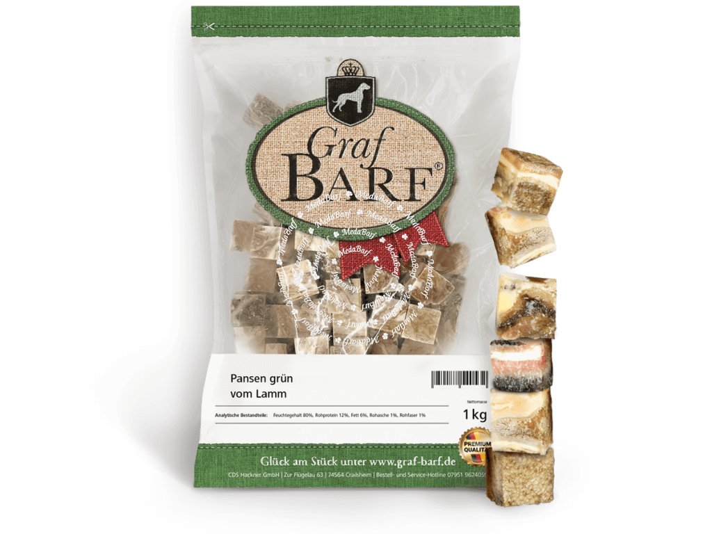 Zelené jehněčí dršťky obsahují cenné zelené živiny a jsou klíčovou složkou syrové stravy. Udržitelným způsobem posilují imunitní systém, dodávají vitamíny a minerály a podporují zdravou střevní flóru vašeho psa. Zelené jehněčí dršťky se mrazí ve velkých blocích a poté se nakrájejí na kostky.