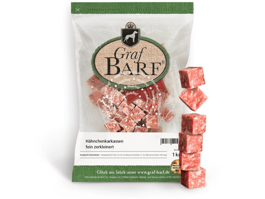 Jemně drcené kuřecí kostry Graf Barf představují vyvážený poměr masa, kostí a tuku, díky čemuž jsou skvělým zdrojem minerálů a energie. Vysoký obsah fosforu podporuje přirozený vývoj a pevnost kostí. Díky jemnému drcení nehrozí riziko spolknutí velkých kostních kusů, což z nich činí bezpečnou volbu pro psy všech věkových kategorií.