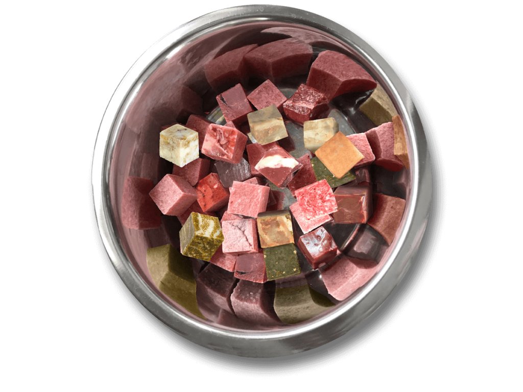 S 16 různými kostkami syrového krmiva Graf Barf (délka hrany 2,5 cm) je zaručeno pestré, druhově vhodné, vyvážené a zdravé psí jídlo.