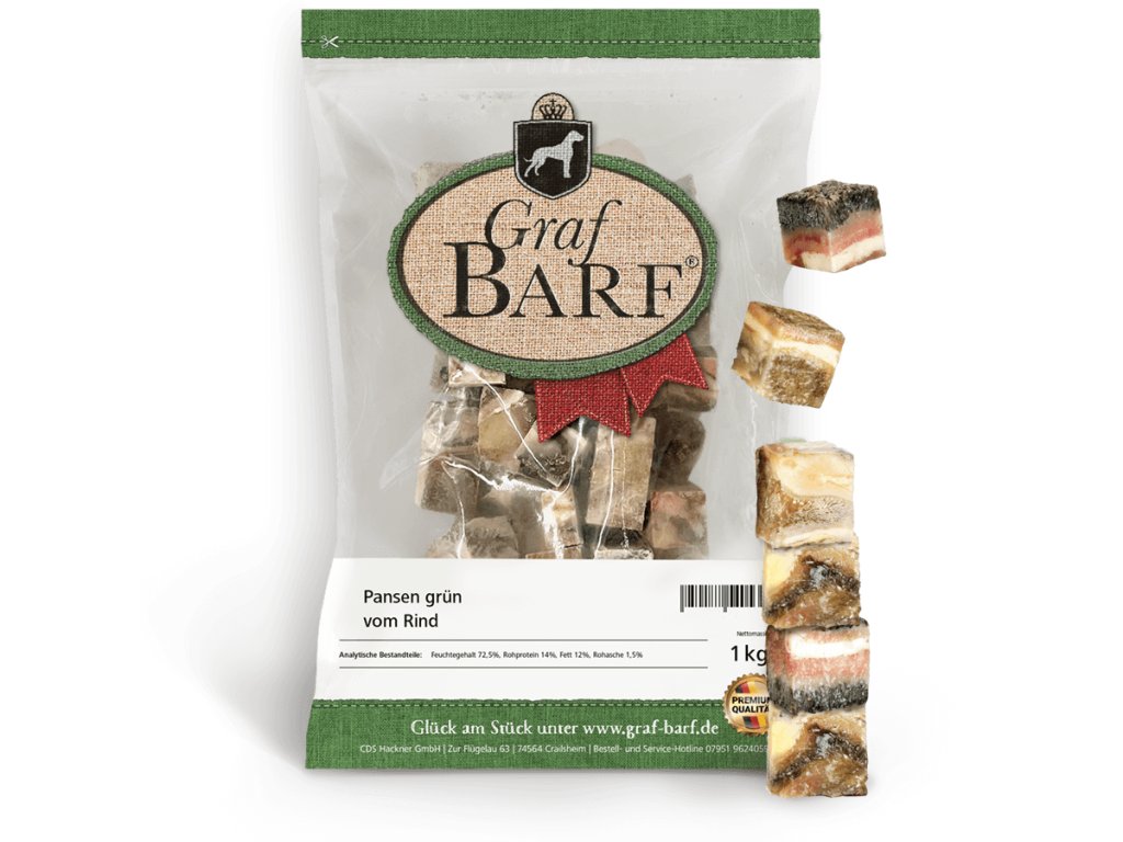 Zelené hovězí dršťky obsahují cenné zelené živiny a jsou klíčovou složkou syrové stravy. Udržitelným způsobem posilují imunitní systém, dodávají vitamíny a minerály a podporují zdravou střevní flóru vašeho psa. Zelené hovězí dršťky se mrazí ve velkých blocích a poté se nakrájejí na kostky.
