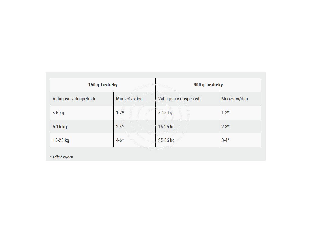 Doporučené dávkování pro dospělé psy s normální aktivitou najdete v tabulce uvedené na obalu. Správnou krmnou dávku nejlépe určíte pravidelným kontrolováním hmotnosti psa. Čerstvá pitná voda by měla být vždy k dispozici. Po otevření skladujte v lednici max. 24 hodin.