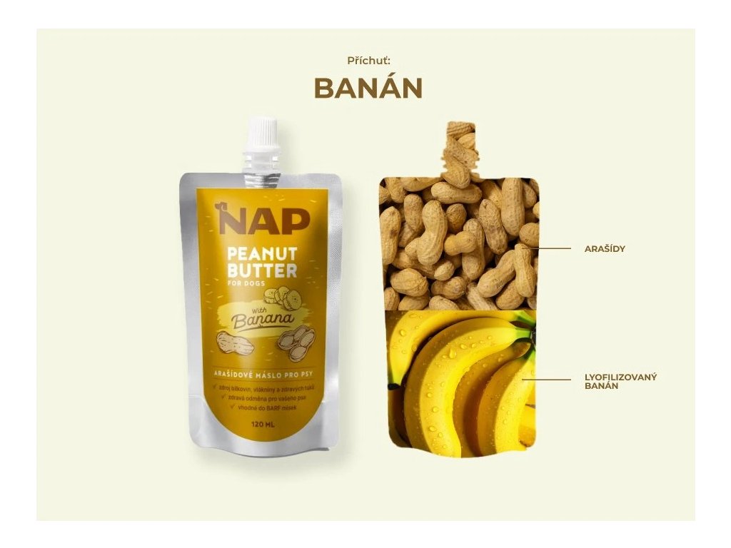 Arašídové máslo vyrábíme pouze z pražených arašídů a lyofilizovaného banánu – žádná sůl, cukr, palmový olej nebo umělé látky.