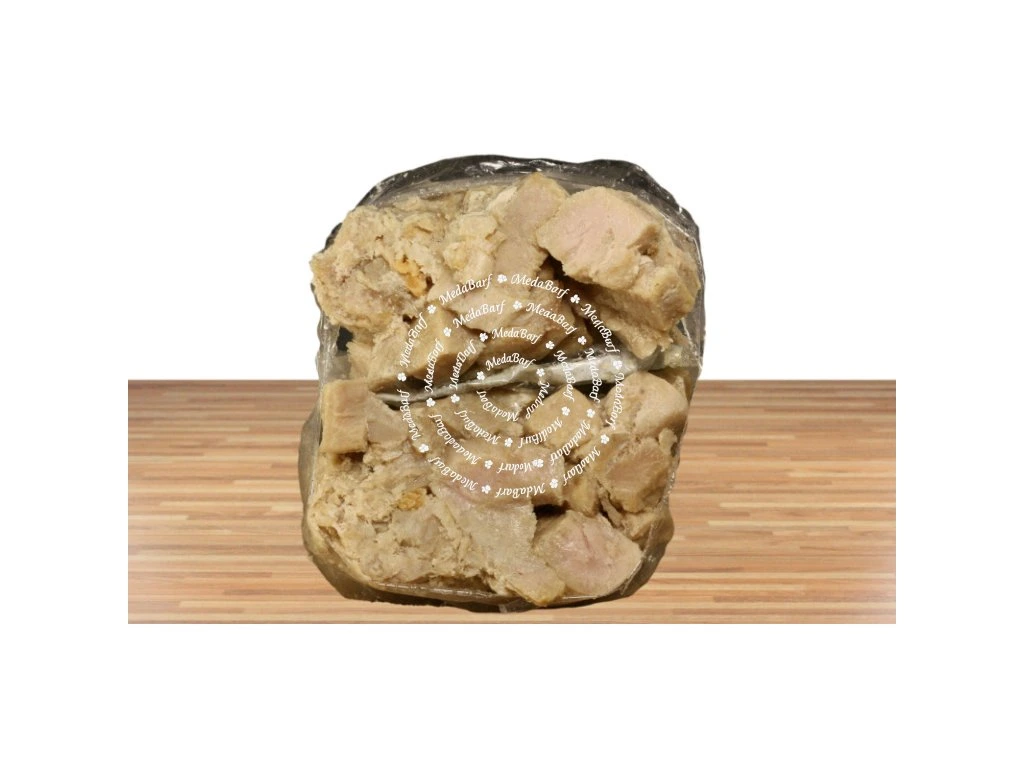 45 % kuřecí maso, 20 % kuřecí kostry, 18 % kuřecí srdce, 8 % mrkev, 7 % jablka a hrušky, 1 % lněný olej, 1 % směs BARF bylin