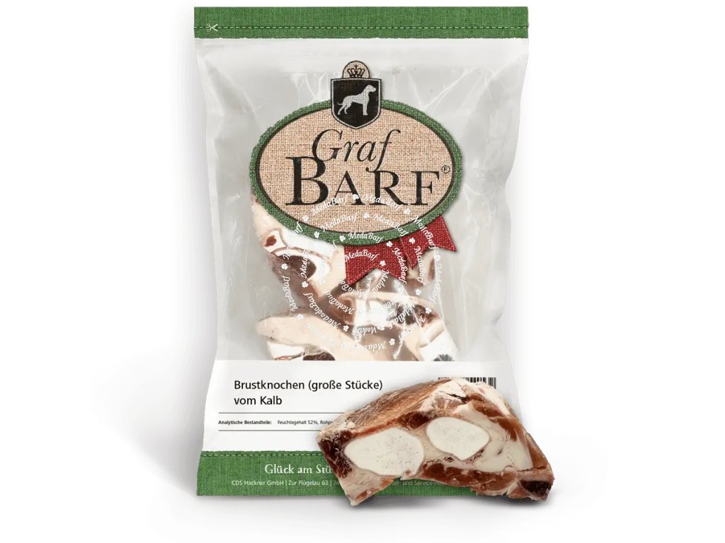 Telecí hrudní kosti Graf Barf jsou měkké, dobře stravitelné a ideální pro malé psy i seniory, kteří často nezvládnou rozkousat tvrdé kosti. Telecí kosti jsou podstatně měkčí než hovězí, a proto je psi snadněji rozkoušou i stráví. Působí jako přirozený kartáček na zuby, podporují zdravé dásně a dodávají organismu životně důležitý vápník a další minerály.